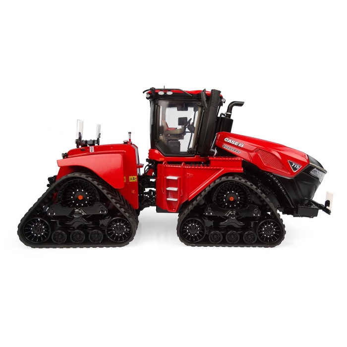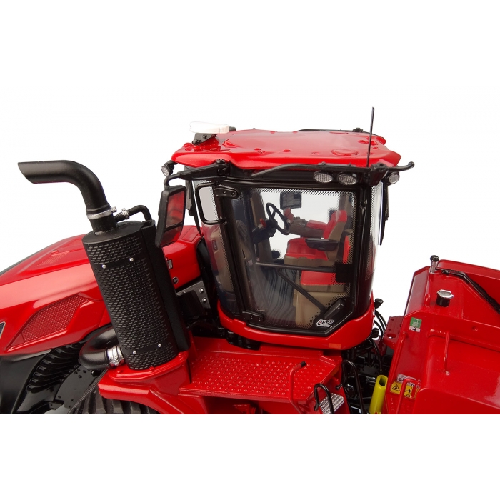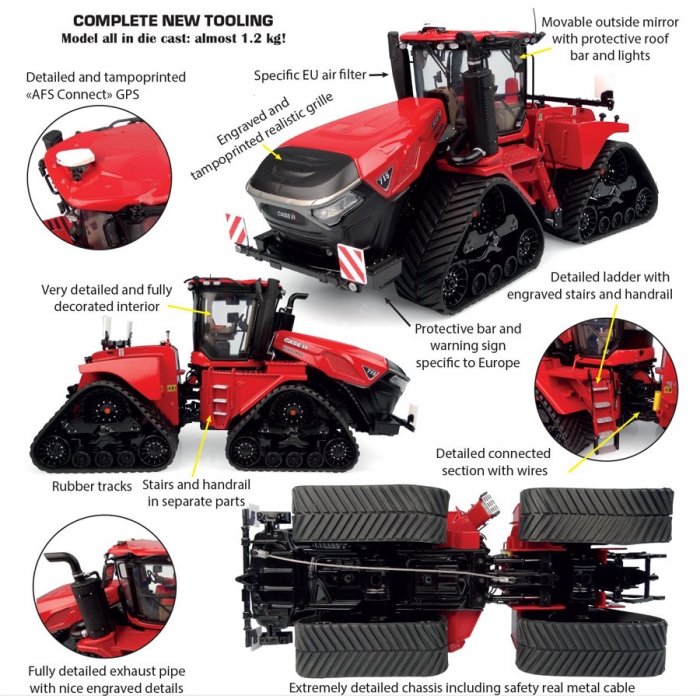 The Case IH Quadtrac 715 tractor has 189 parts and 331 tampo-printing operations. This is a brand new tooling, all in die-cast: the scale model weighs almost 1,2 kg! Tracks are made of soft rubber and are movable. Outside mirrors are foldable. This tractor includes an air filter, protective bars, and a warning sign at the front: all these parts are specific to the European market. The scale model also includes the protective roof bar and lights. And the new "AFS Connect" GPS, made in tampon printing. The side ladder is very detailed, with engraved stairs and handrails. On the other side, stairs, and handrails are also made in separate parts. The inside of the cabin is very detailed and fully decorated: steering wheel, pedals, gears, seat... The chassis is also very detailed with safety metal cable, like on the real tractor. This die-cast model in 1/32 scale is a very high quality and accurate replica of the new Quadtrac 715: a novelty that must have a front-row location on the shelf of each good collector!