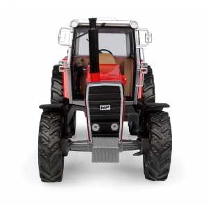 • Realistic features with a cabin clear window with a black frame and gray roof and a door on the right side of the cabin, a  MF rectangular emblem in the front, 2625 numbering with a stripe in tampo printing on the side of the hood, an exhaust stack, a front weight, rubber tires with an engraved pattern, and adjustable third-point linkage.