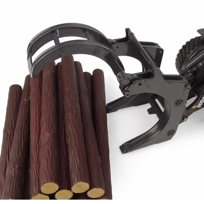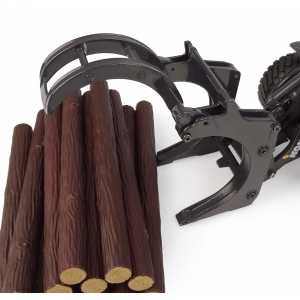 • Realistic features with a functional loader arm that folds and unfolds, an open and close log grapple, a detailed cabin interior, rubber tires, and accurately reproduced cables.